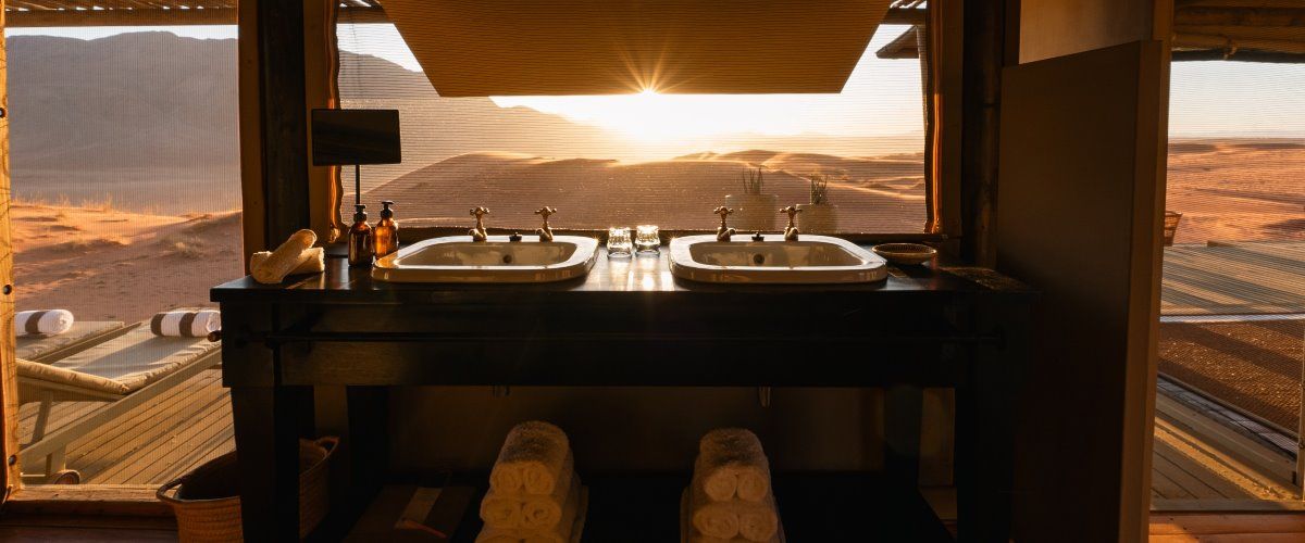 8 stylish en-suite tents under free flow canvas roofing on stilted cement foundation
